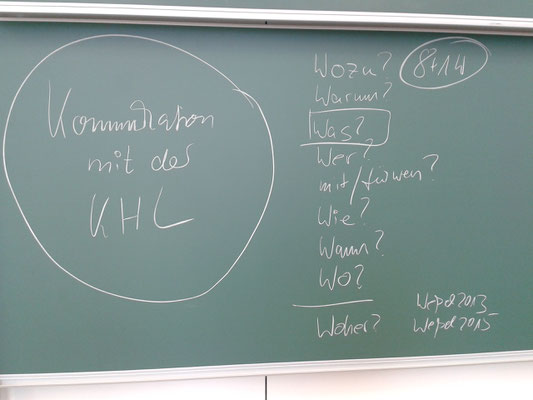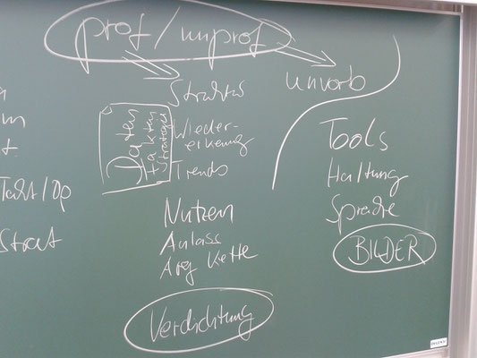 Wir orientierten uns dabei an den 8+1 W: Wozu? Warum? Was? Wer? Mit Wem / für Wen? Wie? Wann? Wo? Und: Woher? Nachdem wir das "Was" geklärt hatten - was ist Kommunikation und über welche Kommunikation sprechen wir hier? - gingen wir zum Wer und Wie über und entwickelten anhand der Gegenüberstellung von professionellem und unprofessionellem Arbeiten, was für eine gute Kommunikation erforderlich ist und welche Maßnahmen diese unterstützen können.
